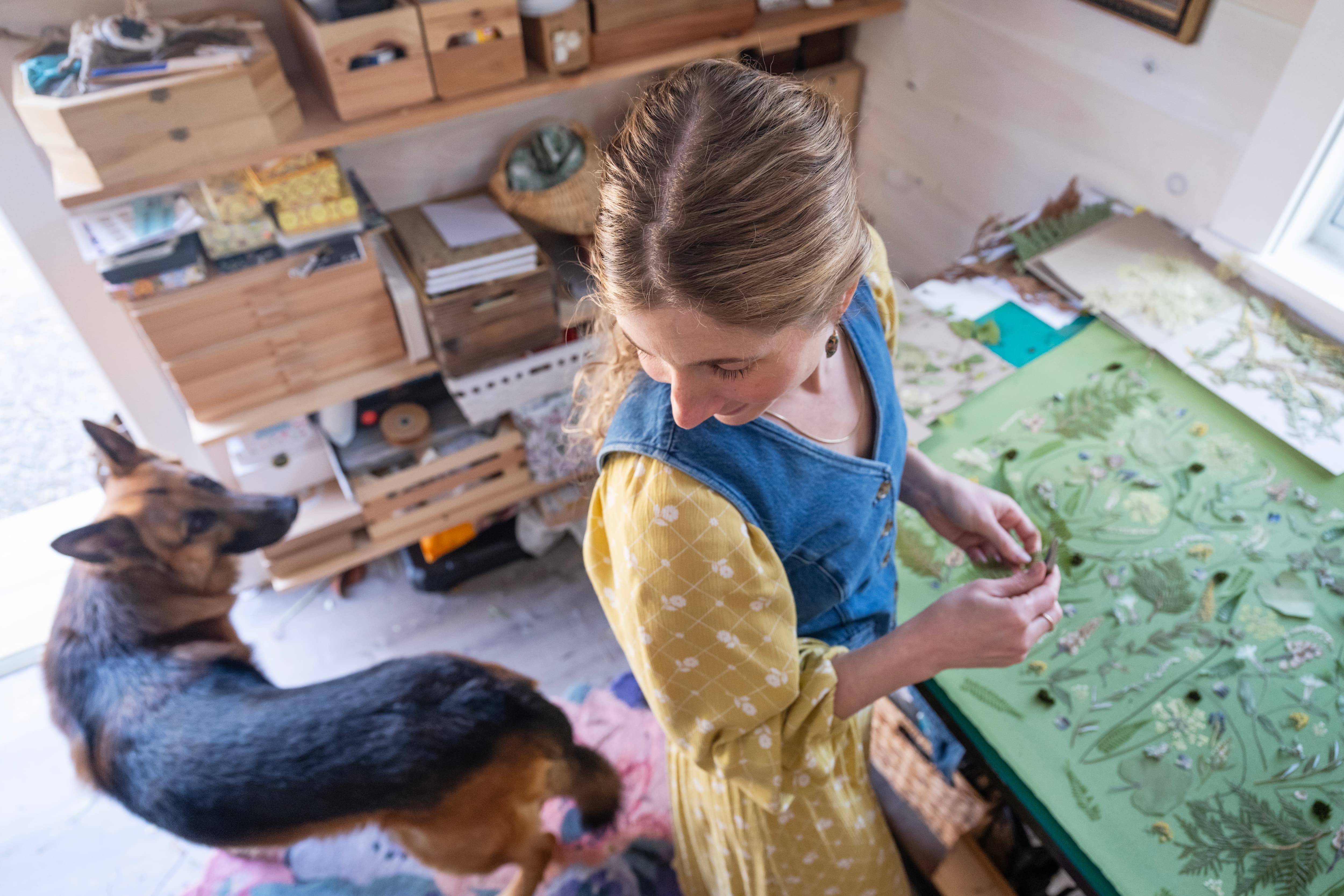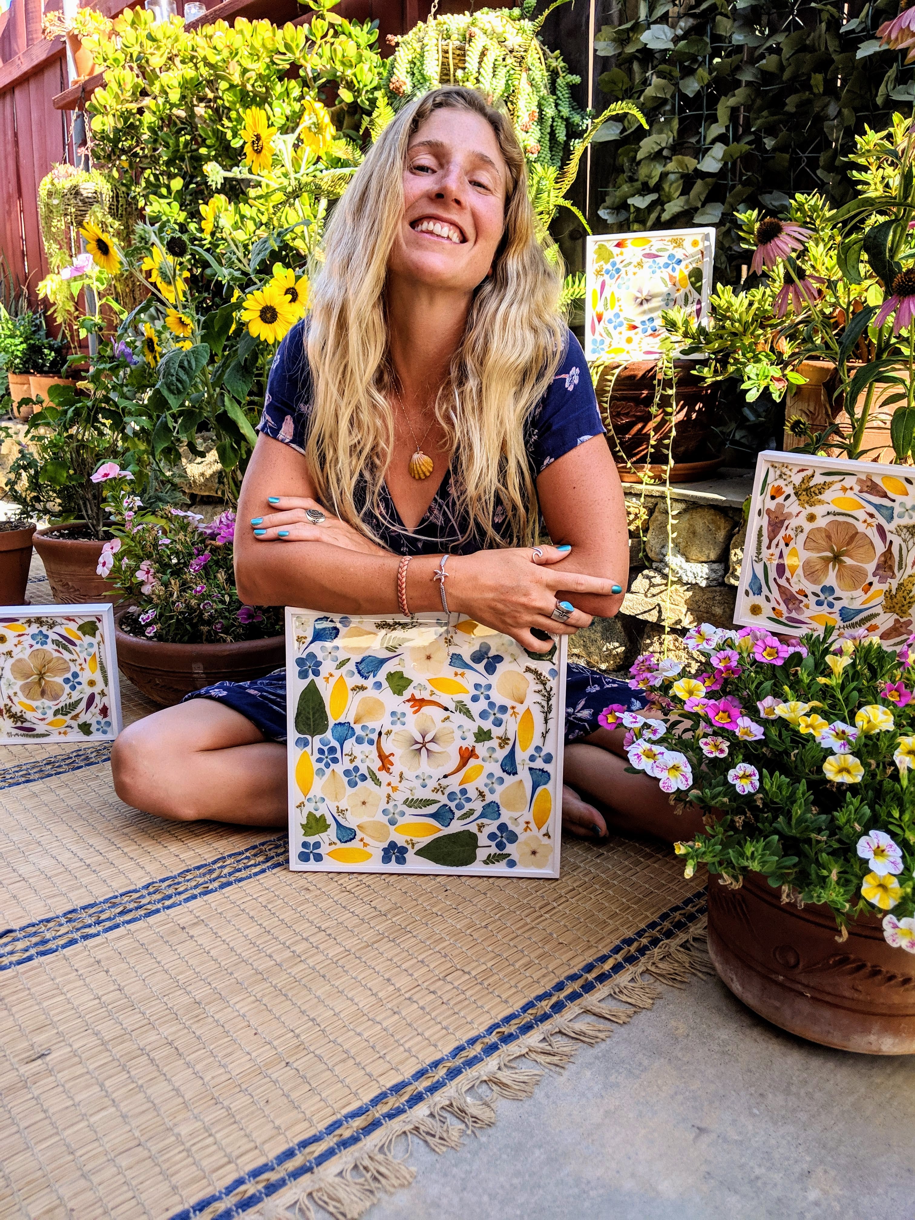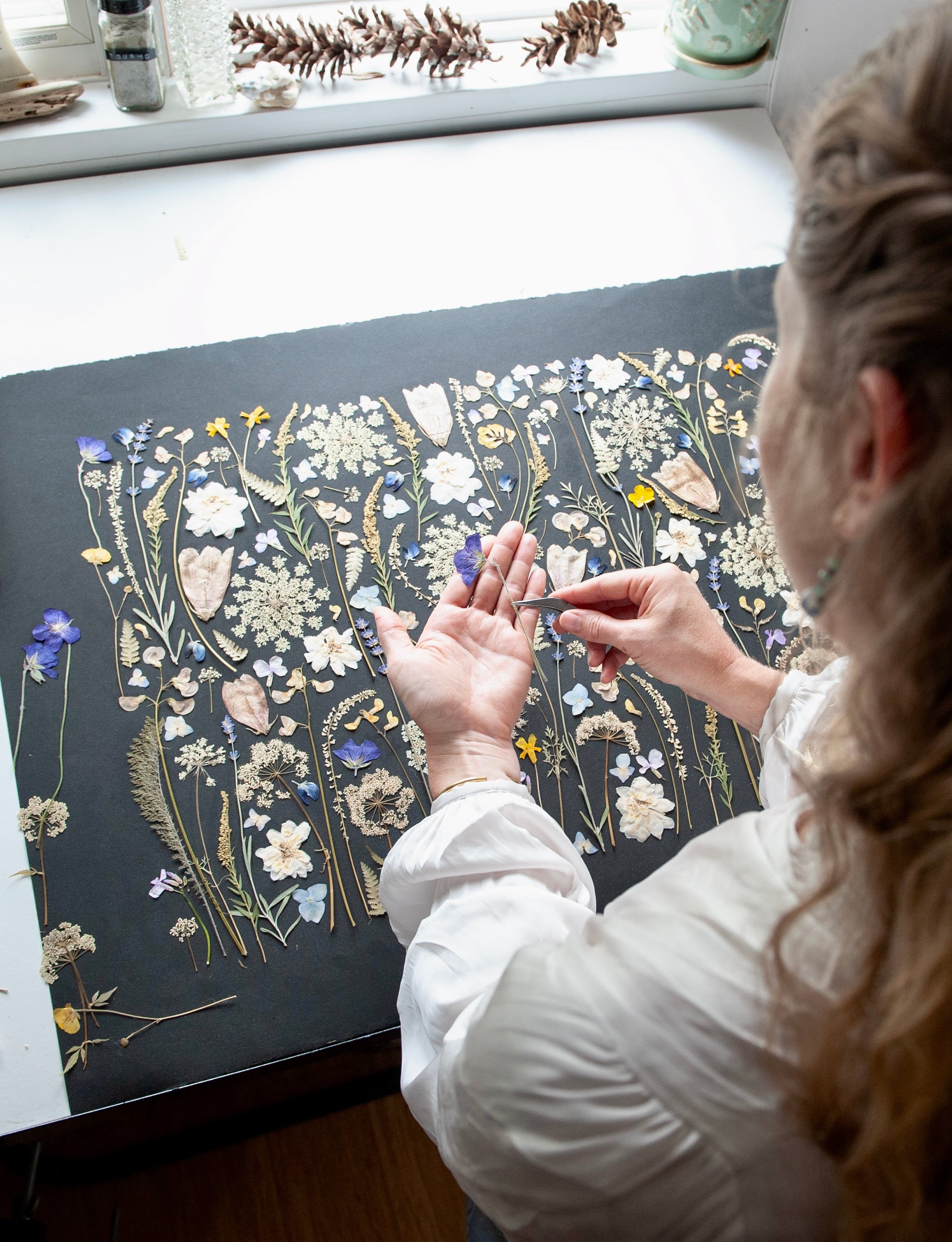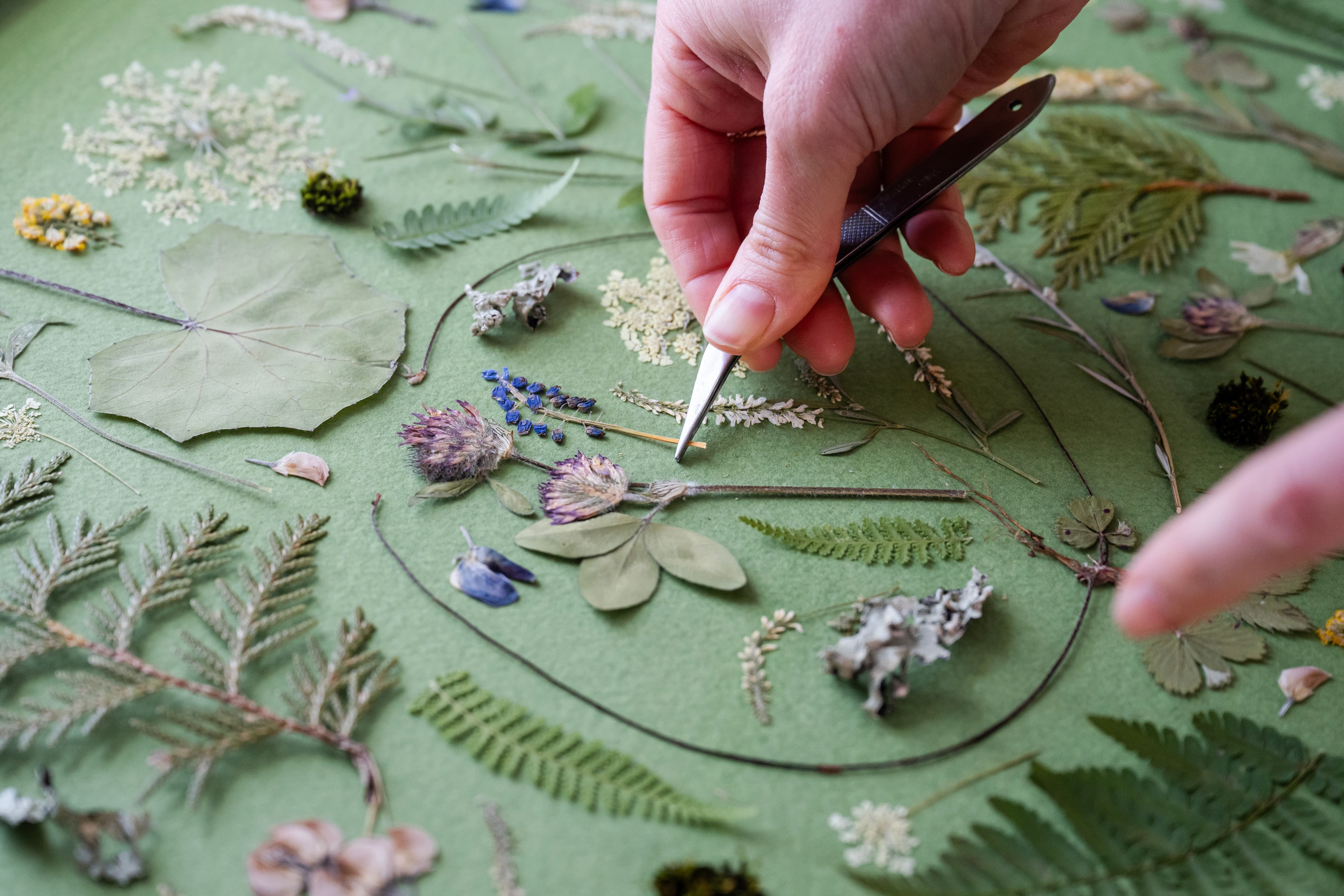 Each piece is created using botanicals she forages and presses by hand—often collected on hikes, shoreline walks, and daily explorations throughout the Maine landscape.