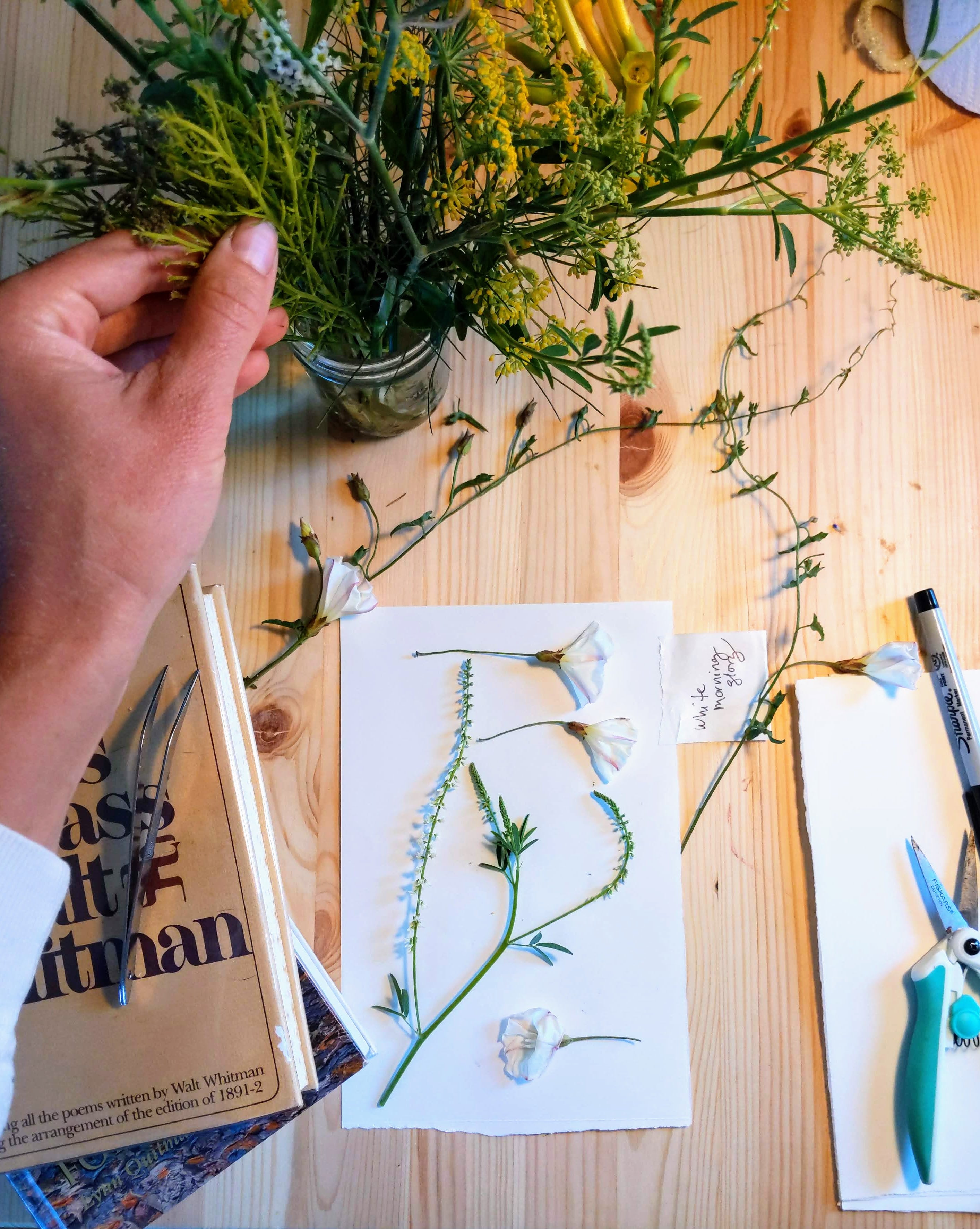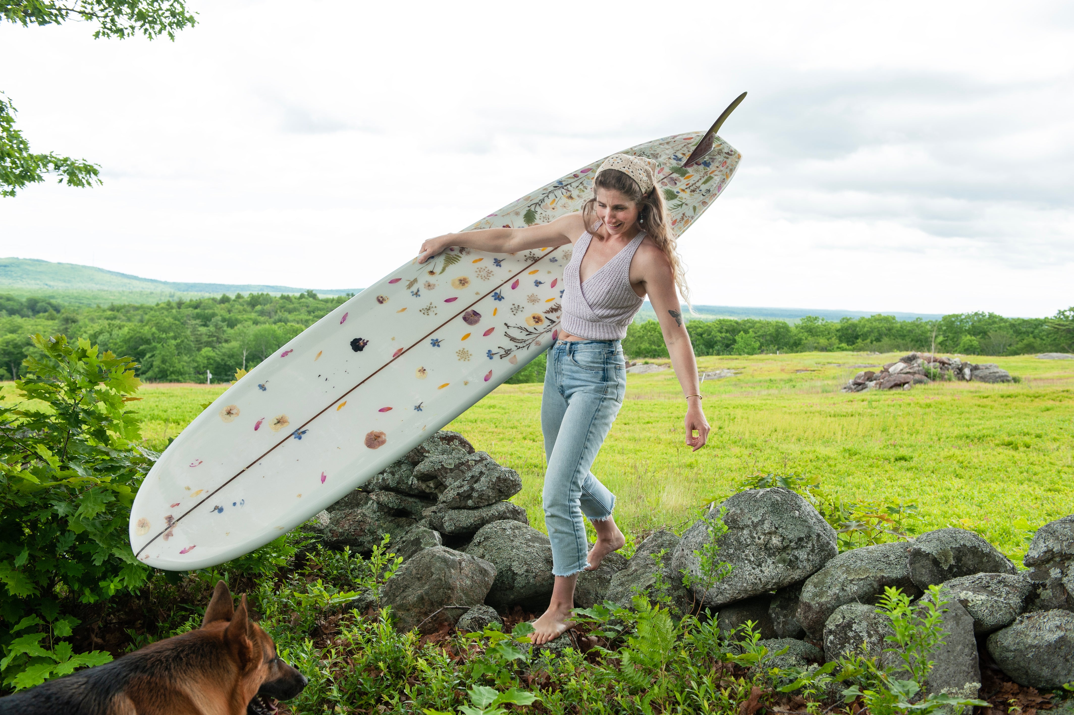 When not pressing flowers, Gabrielle can often be found wandering forest trails with a basket in hand, beachcombing Maine’s rugged coastline, or paddling out for a surf—always inspired by the shifting light and living textures of the natural world.
